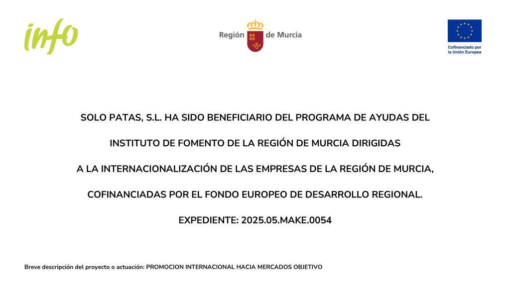 SOLO PATAS, S.L. HA SIDO BENEFICIARIO DEL PROGRAMA DE AYUDAS DEL INSTITUTO DE FOMENTO DE LA REGIÓN DE MURCIA DIRIGIDAS A LA INTERNACIONALIZACIÓN DE LAS EMPRESAS DE LA REGIÓN DE MURCIA, COFINANCIADAS POR EL FONDO EUROPEO DE DESARROLLO REGIONAL.