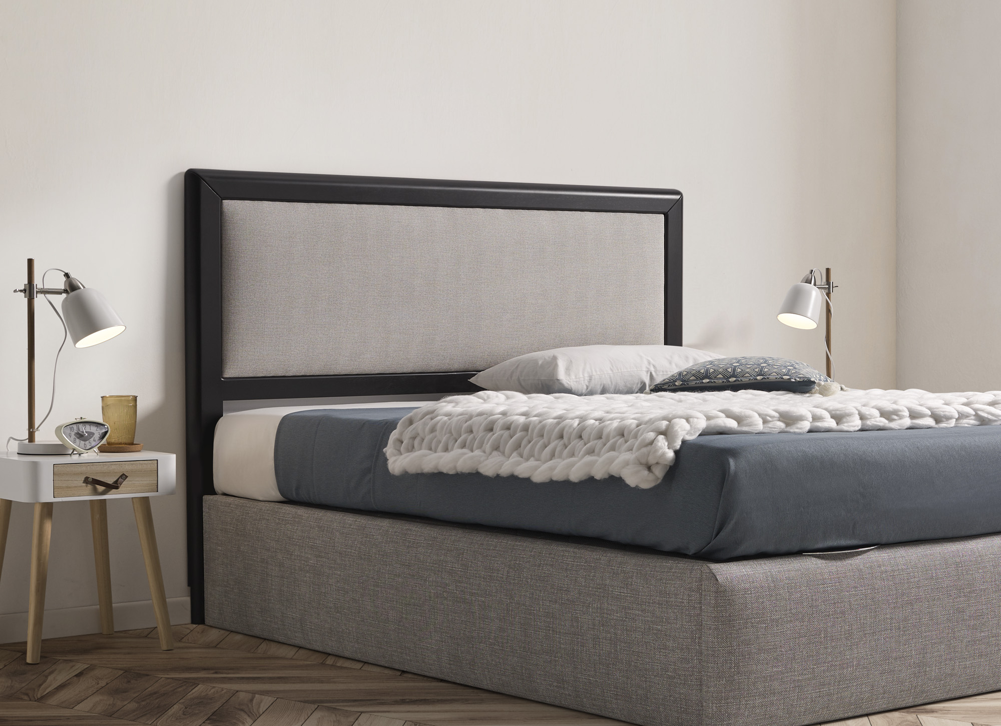 Cabecero CON MARCO Y PATAS DE MADERA NATURAL LACADO Y PLAFON CENTRAL TAPIZADO.